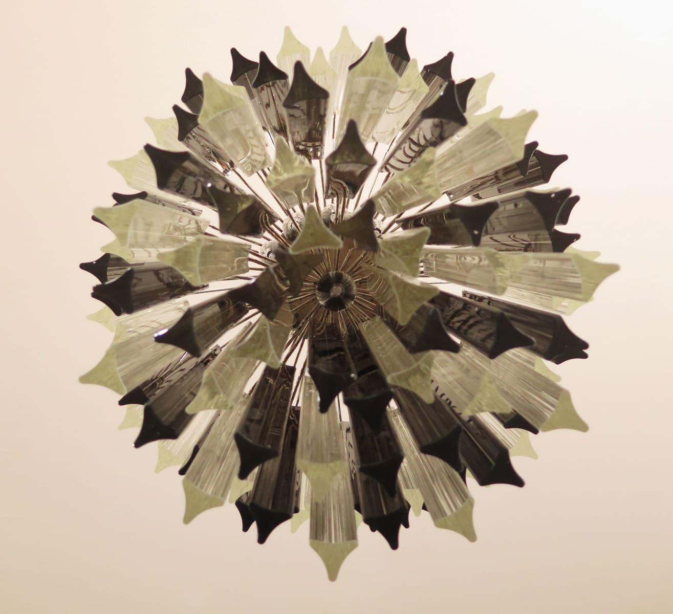 Få en smak av äkta italienskt hantverk med vår fantastiska Murano-ljuskrona. Denna skönhet är handgjord av 107 mörk rökfärgade och klara Murano-prismor, var och en omsorgsfullt inramad i metall.