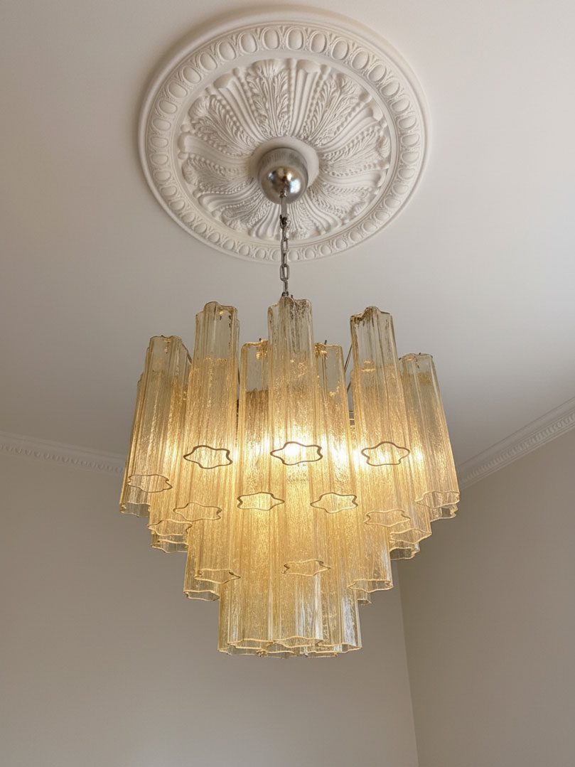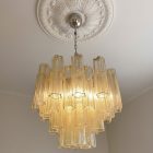 Unna dig själv lyxen och skönheten i denna eleganta italienska ljuskrona som kommer att lägga till en touch av sofistikering till ditt hem. Den är gjord av 36 vackra gula Murano-rör som skapar en stjärnformad konstellation, vilket gör den till ett iögonfallande konstverk.