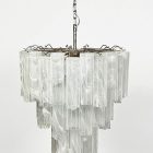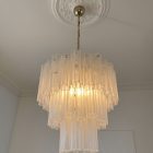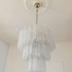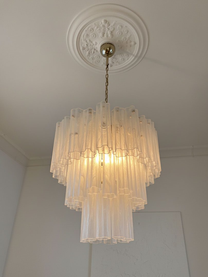 Italiensk ljuskrona med Muranoglas på metallstruktur. Lampskärmen bär 48 stora vita glasrör i alabasterform i stjärnform.
