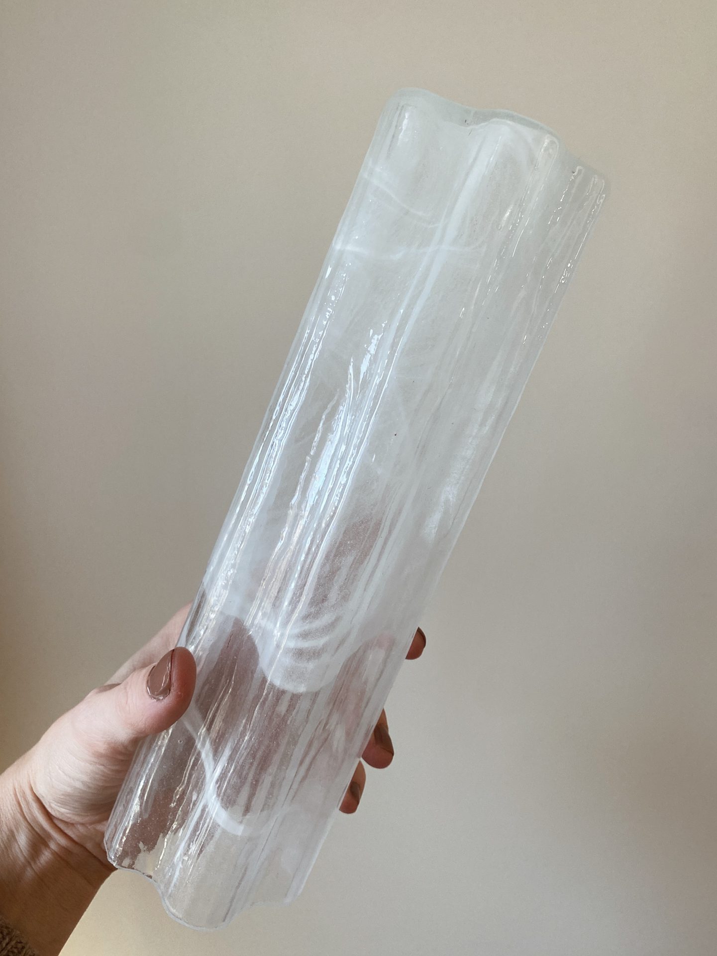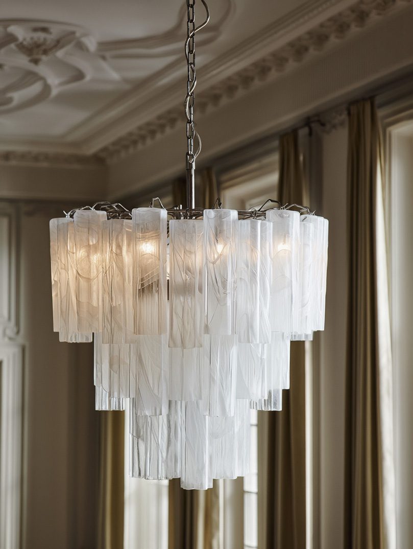 Vid glastillverkning används alabaster för att uppnå en unik opacitet och genomskinlighet, vilket ger glaset en nästan marmorliknande kvalitet. Konstnärer använder ofta denna teknik för att skapa skulpturer, lampskärmar, vaser och i vårt fall det vackra Poliedri-glaset för ljuskronor.