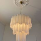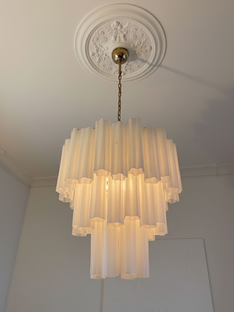 Italiensk ljuskrona med Muranoglas på metallstruktur. Lampans ram har 48 stora mattvita glasrör i stjärnform.