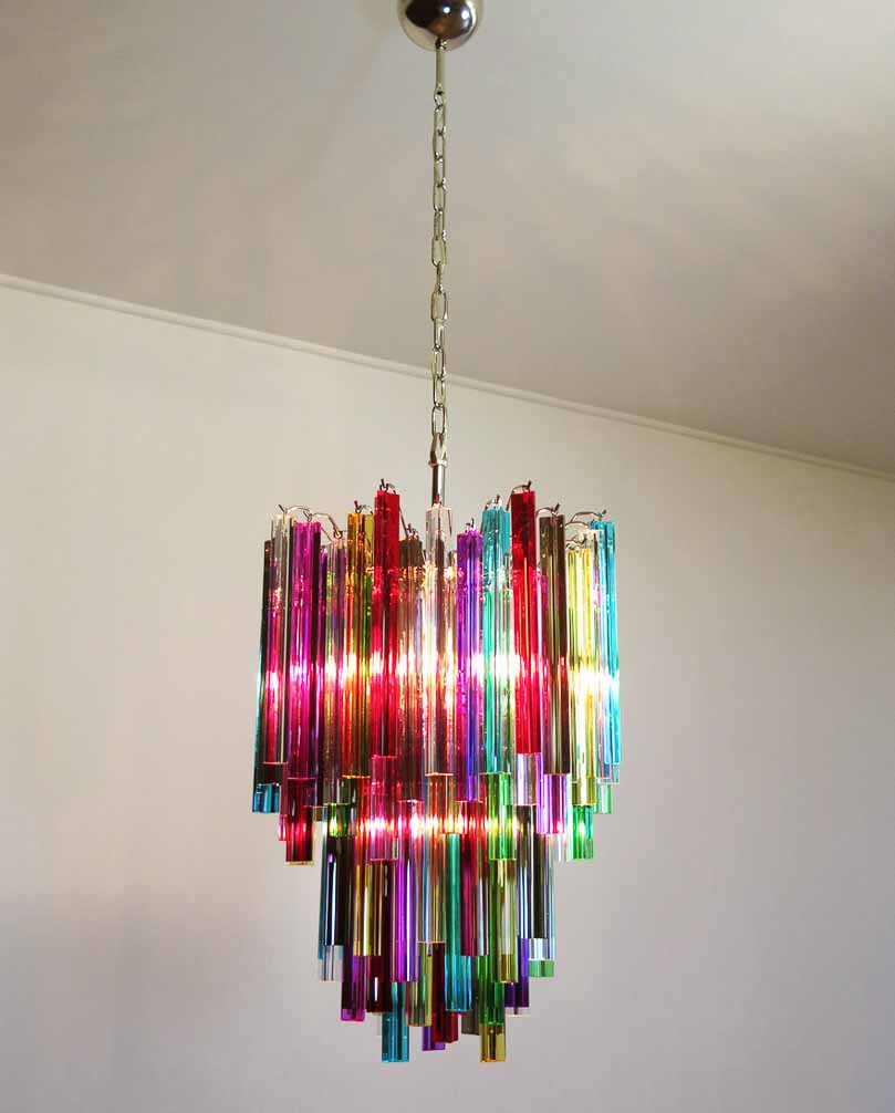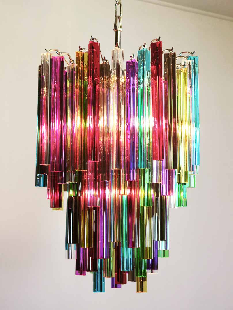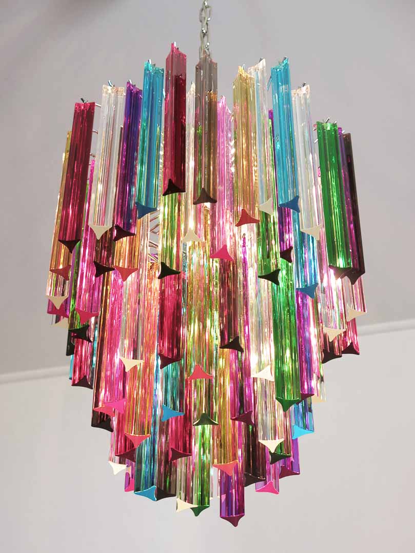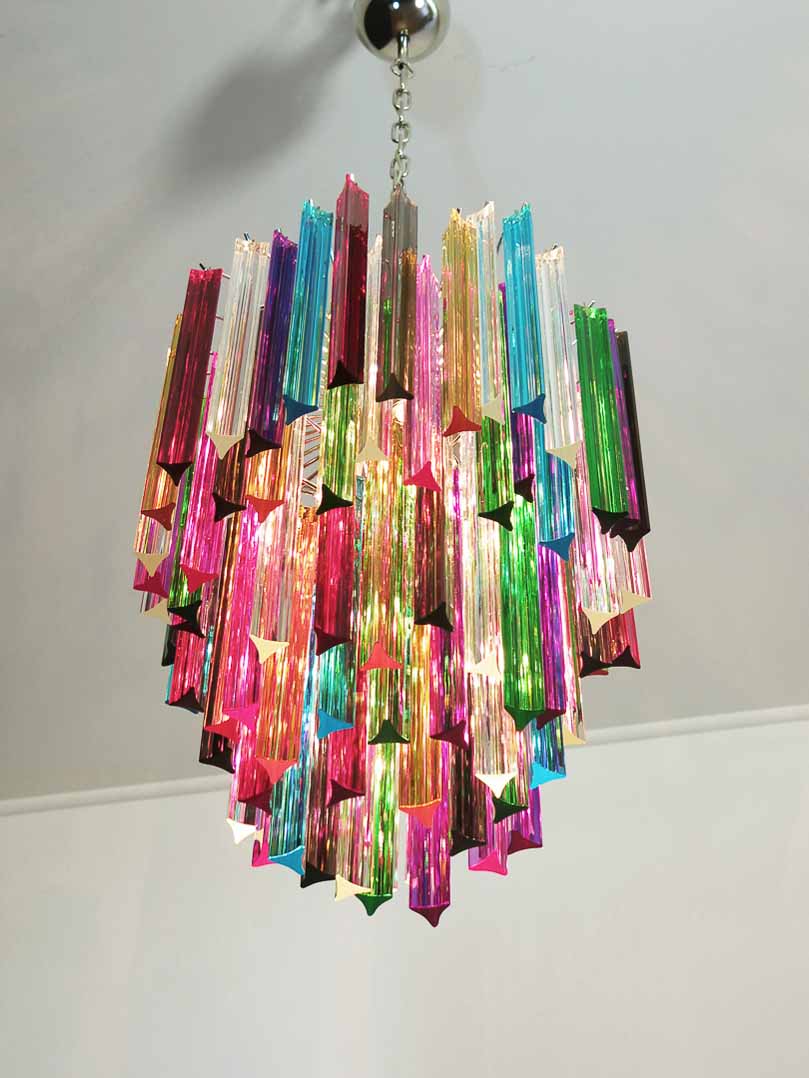 Skäm bort ditt hem med extraordinär skönhet med vår fantastiska Murano-ljuskrona. Denna unika ljuskrona är tillverkad av 92 flerfärgade Murano-kristallprismor som är omsorgsfullt inramade i en metallram.