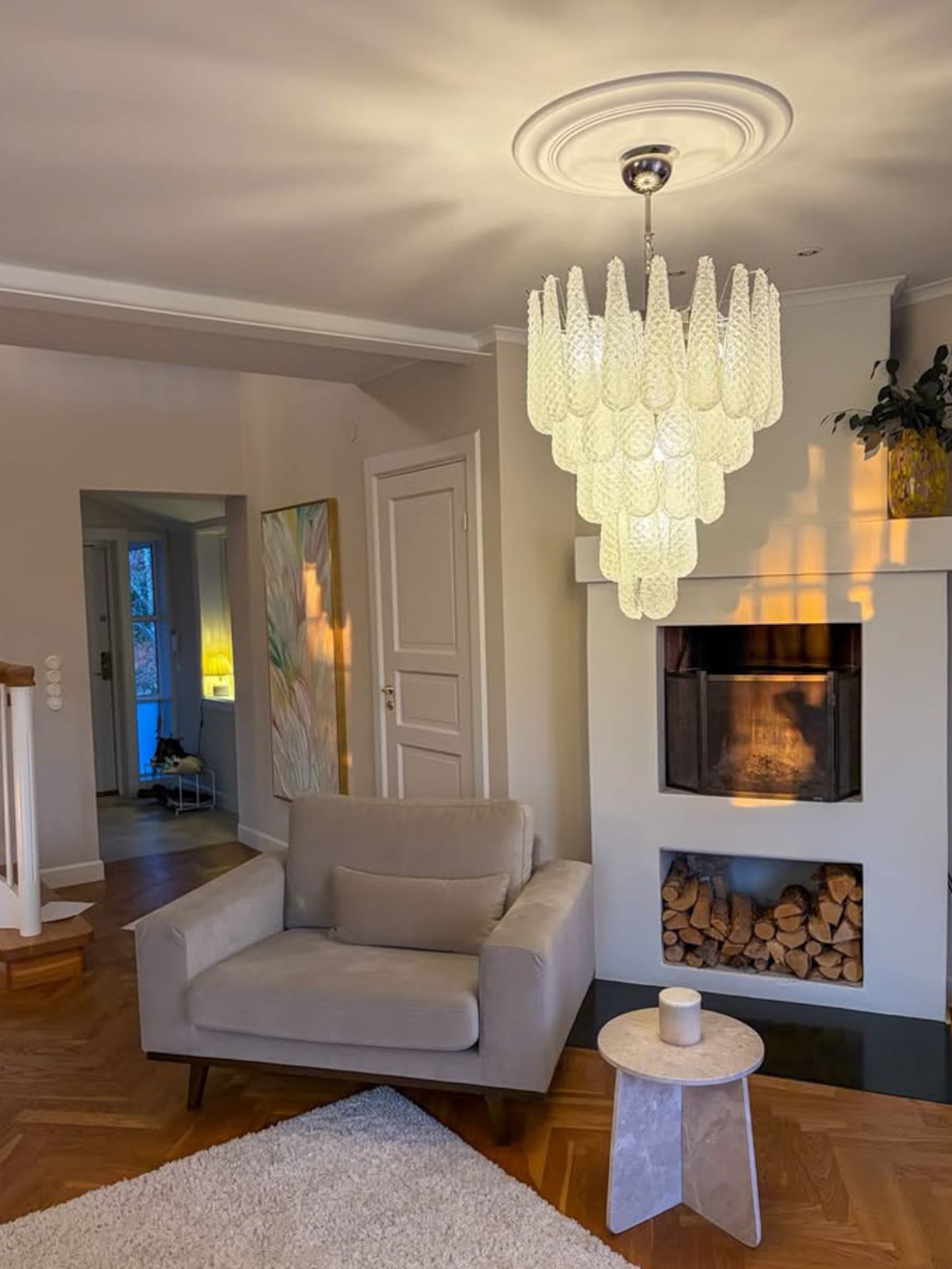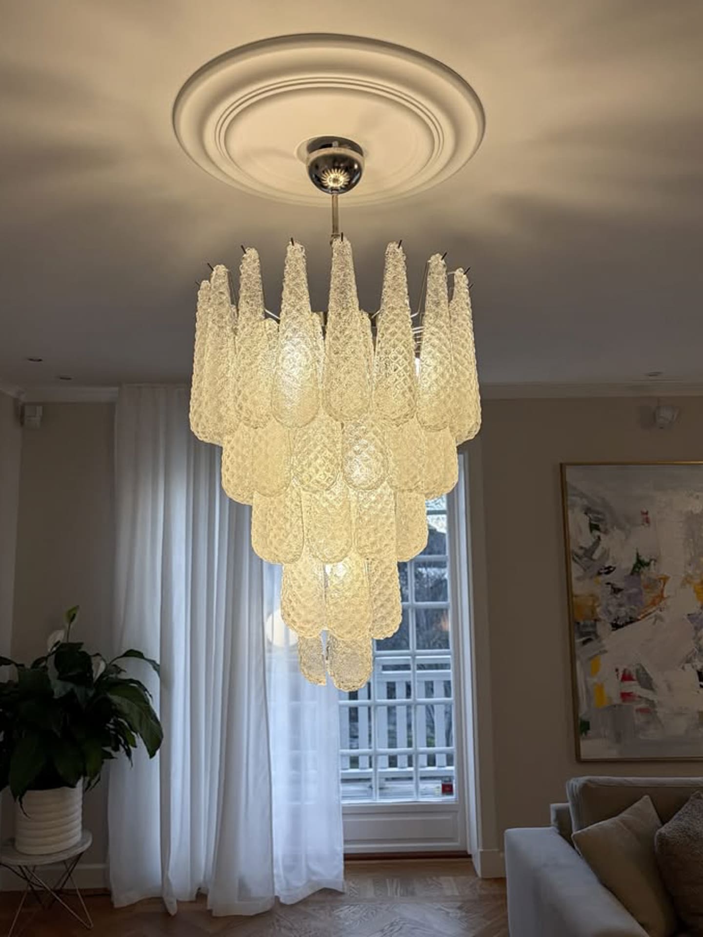 Mått: 140 cm i höjd med kedja (kan förkortas och förlängas) 75 cm i höjd utan kedja, 66 cm i diameter.