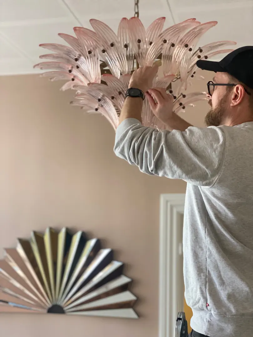 Skäm bort ditt hem med en modern Murano-ljuskrona som kombinerar traditionell italiensk stil från mitten av århundradet med 2000-talets elegans. Denna imponerande ljuskrona består av 58 fjäderformade kristallprismor i roséglas som skapar ett vackert och fascinerande ljus.