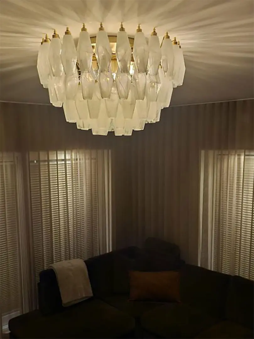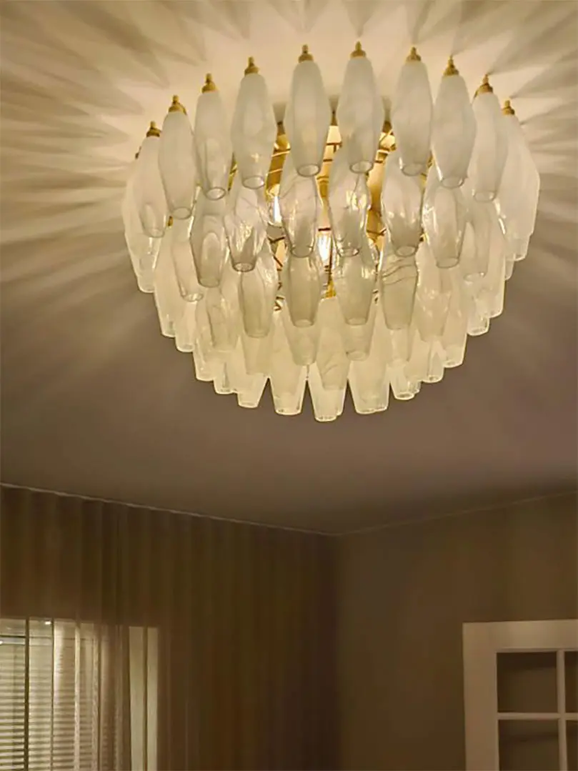 Den raffinerade, geometriska designen gör den idealisk för montering direkt i taket eller på en dekorativ rosett, och smälter sömlöst in i både klassiska och moderna interiörer. Upplev den tysta sofistikeringen och konstnärligheten hos äkta Murano-glas med denna anmärkningsvärda italienska skapelse.